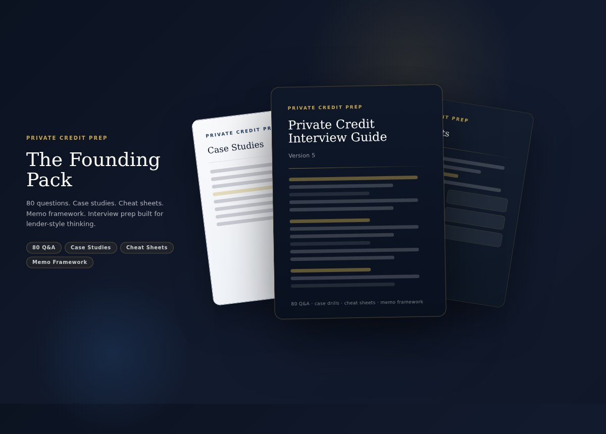 80 questions with model answers, case-study drills, cheat sheets, and a deal memo framework — one prep stack built around how direct lenders actually interview.